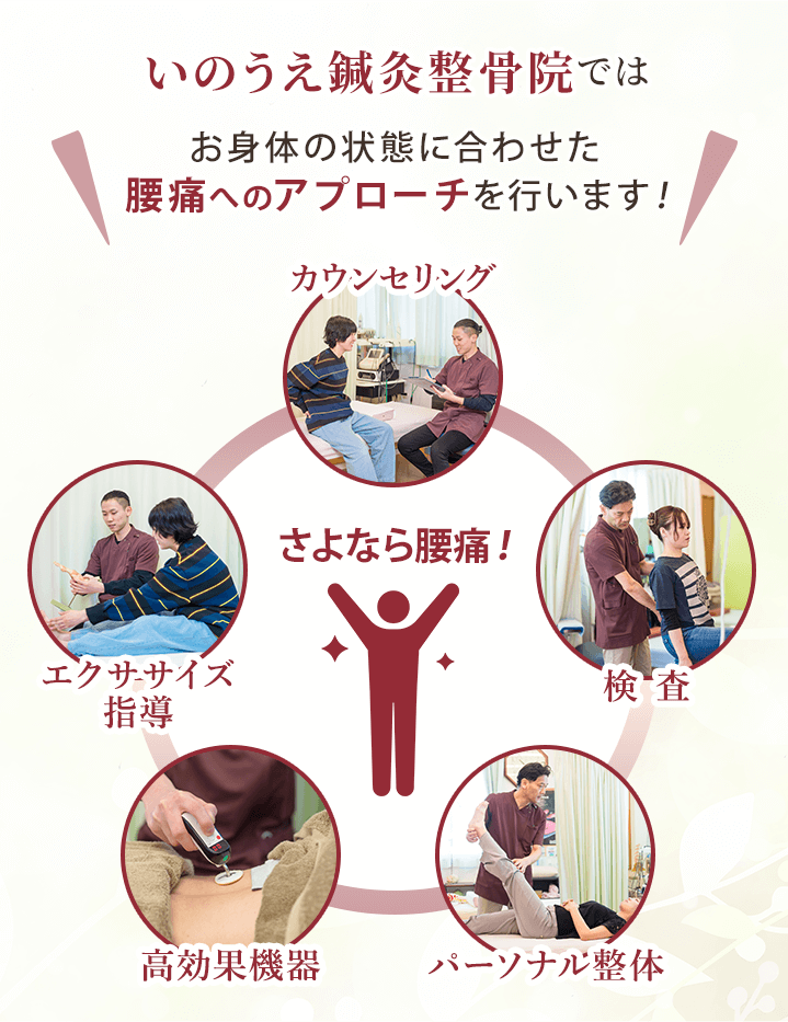 ⼭梨県甲府市の、いのうえ鍼灸整骨院では、様々な腰痛をみてきた⻑年の経験から、腰痛専⾨知識を得、独⾃の施術法に取り組み、皆様に喜ばれております。本気で腰痛を治したい⽅、ぜひご相談ください!